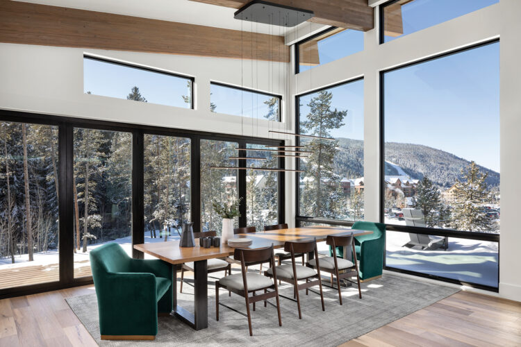 Seating arrangements float lightly within the rooms, circulation paths stay clear of window walls, and nothing interrupts the long visual pull to the peaks. “Furniture was kept low and light, so you never lose that connection to the outdoors, even when you’re sitting down,” Rynes says.