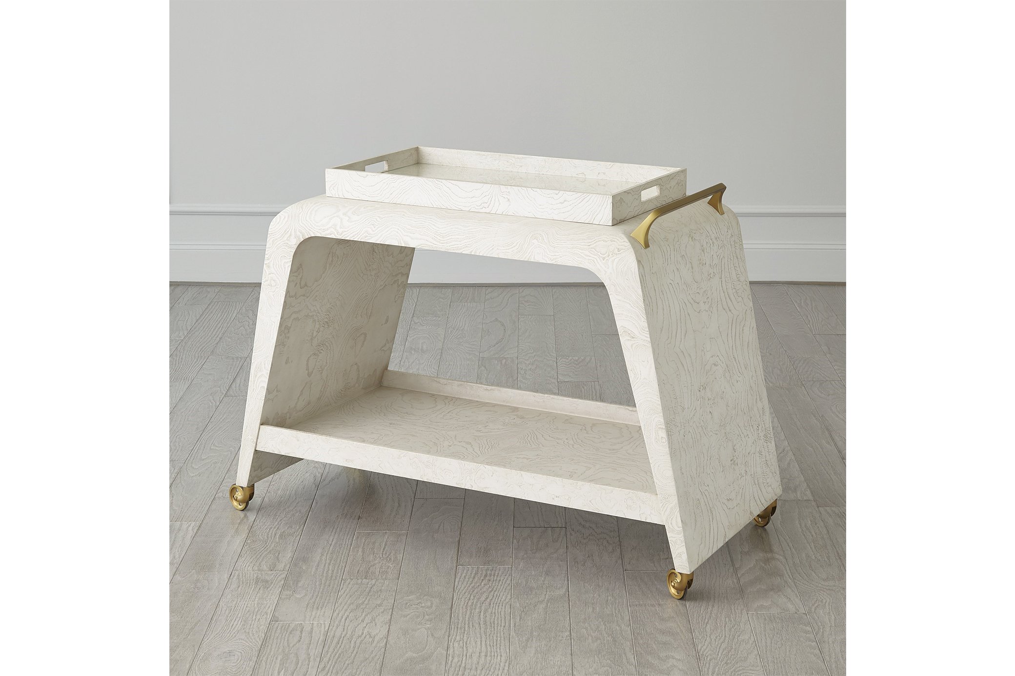 “We love us a good bar cart! This one in particular is amazing because of the finish, and the top tray is removable,” Cullen says. The Baxter Bar Cart by Ashley Childers for Global Views is a modern iteration of classic metal and glass bar carts, with a beachy vibe that’s perfect for the cottagecore aesthetic. The cart is constructed of beech, poplar, and ash with a white burl finish and satin brass handles and wheels. A removable top tray and antique mirror shelf add to its elegance and functionality. “Using a sculptural piece of furnishing in a utilitarian manner is a fun way of creating a unique vignette without forgoing function,” Cullen says. “This bar cart used for breakfast in bed or brunch on the patio creates a beautiful moment.”